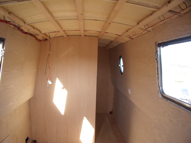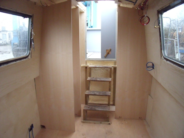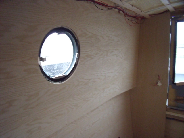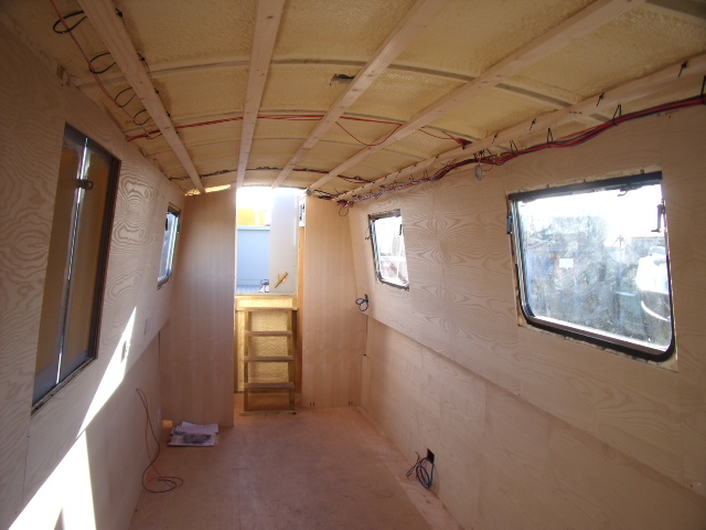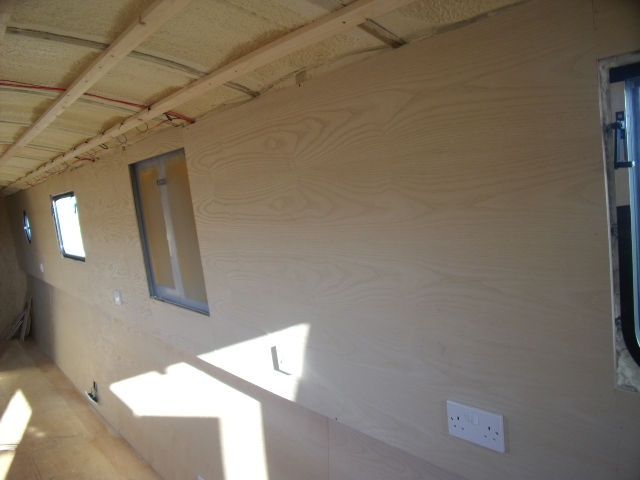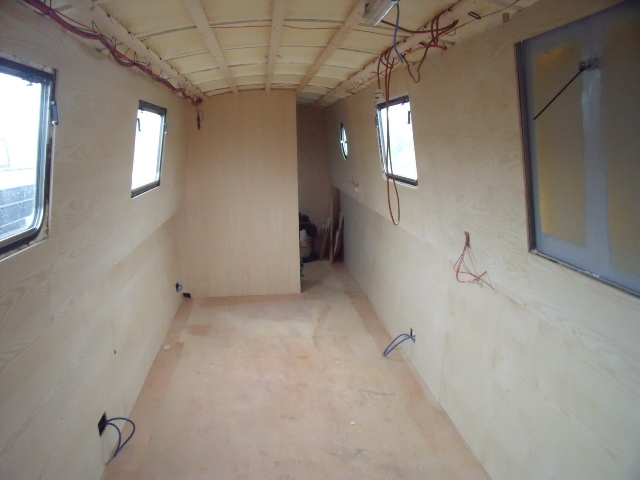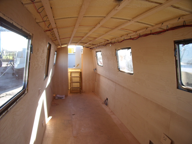 This narrowboat sailaway has been battened and sprayfoam insulation, then 1st fix electrics then partially lined with ash veneered boards , just needs finishing off.